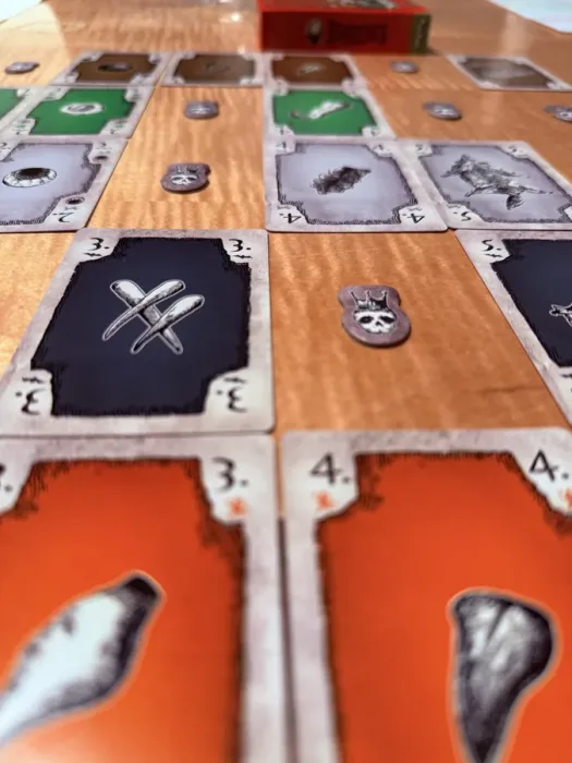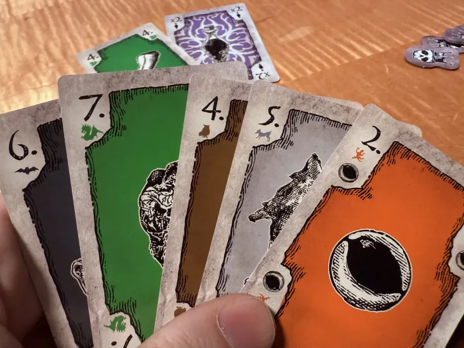 The Lead Witch plays two cards (one face down), while the two Lesser Witches combine one card each. Two ingredients of the same rank or suit get added together, leading to tricky situations!