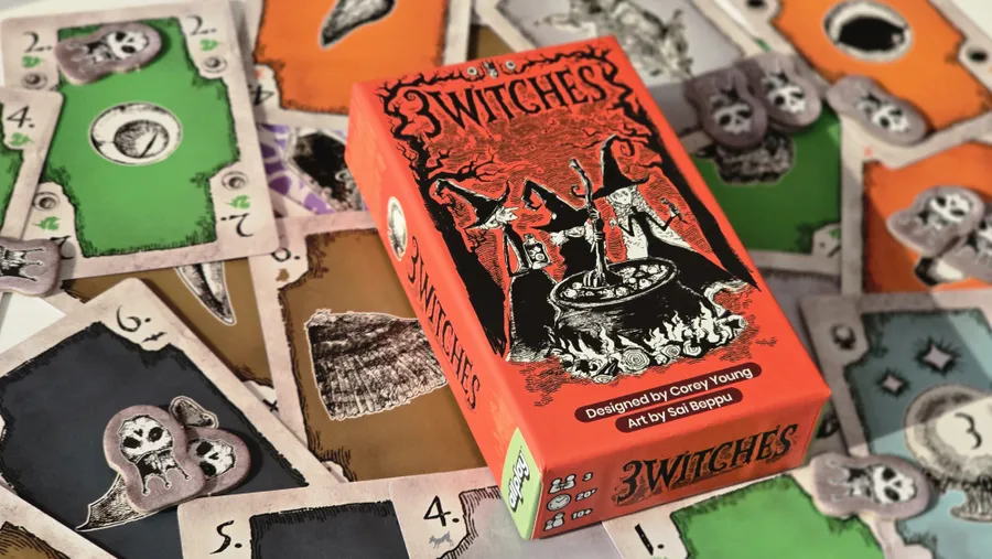3 Witches is a must-follow, trick-taking game with no trump suit. At the start of each round, players bid on how many tricks they can win (out of five). The highest bidder becomes the Lead Witch, and their opponents play together on a team as Lesser Witches.