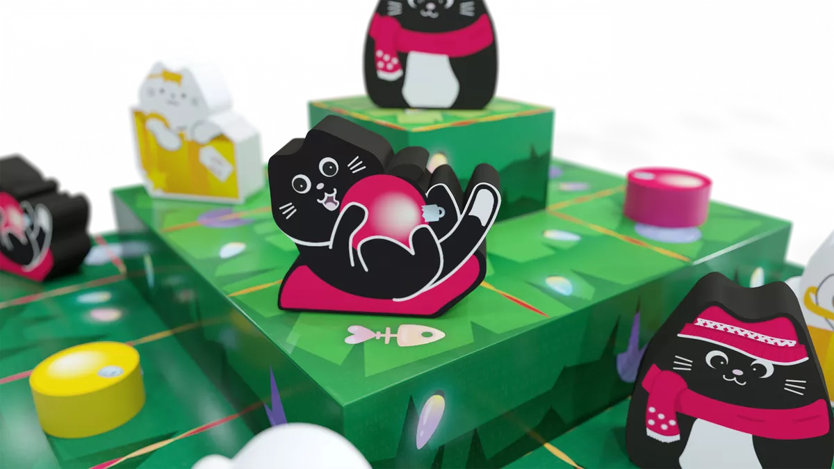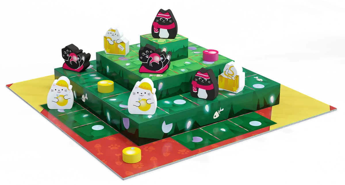 The hoomans are hanging ornaments on the highest boughs of the tree, but those clever cats are leaping up and boopin’ them right off. You can win “Naughty” by knocking off 3 of your opponent’s ornaments or “Nice” by lining up three cats in a row!