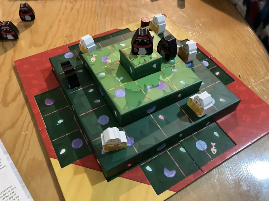 The 4-tiered game board ‘tree’ presents a surprisingly mind-bending 3D challenge for players. And the alternate win condition of knocking off 3 of your opponent’s ornaments creates new strategic problems to solve, elevating the play experience to a new high!