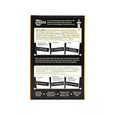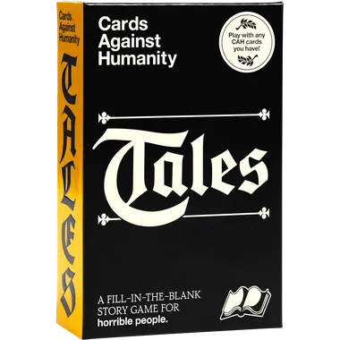 Tales is a storytelling-based party game that incorporates cards from Cards Against Humanity. Players use their cards to fill in blanks within prewritten story templates, creating humorous or unexpected narratives.