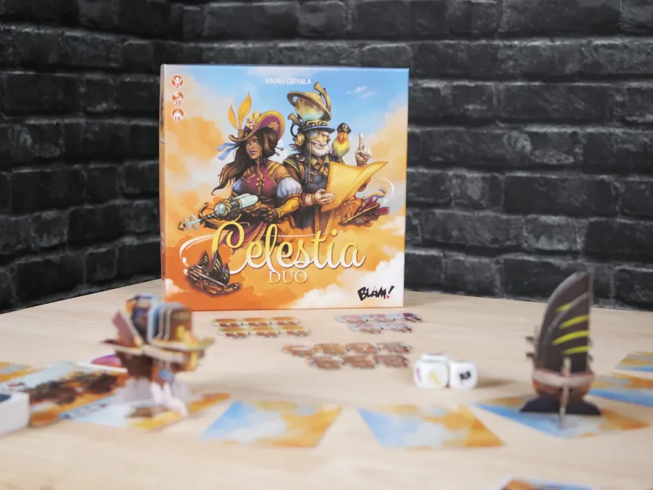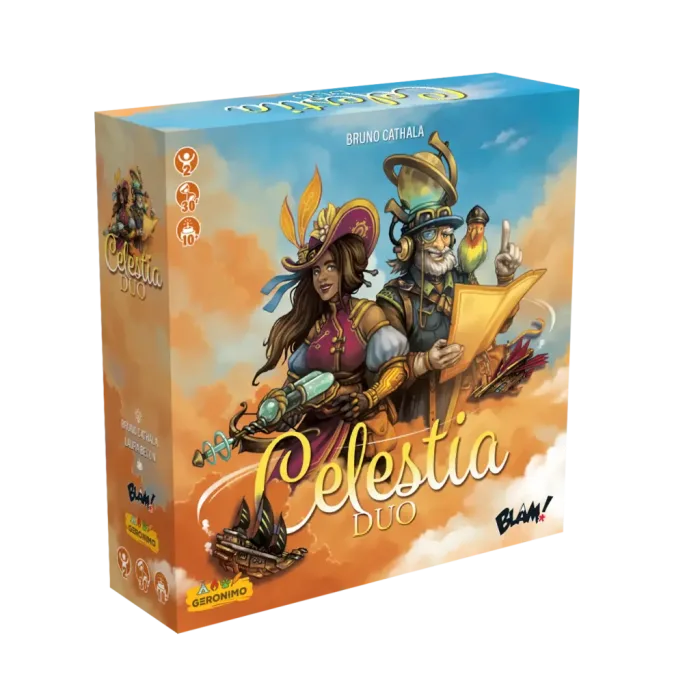 Piraten hebben de vliegende steden van Celestia geplunderd en vluchten. Zet een gevaarlijke achtervolging in met je vliegtuig om hun schip te vangen voor het te laat is! Celestia Duo is een coöperatief spel voor 2 spelers met beperkte communicatie. Deel tijdens je reis de kaarten om hinderlagen te verijdelen. Anticipeer op de hand van je partner, want als een van jullie tijdens zijn beurt niet tegen een dobbelsteen kan vechten, loopt het vliegtuig schade op. Stop op het juiste moment in de vliegende steden om voorraden in te slaan en passages met nuttige vaardigheden te rekruteren…
