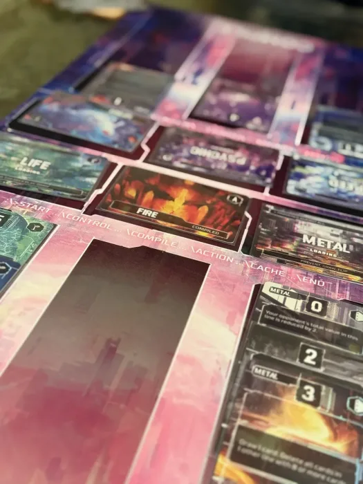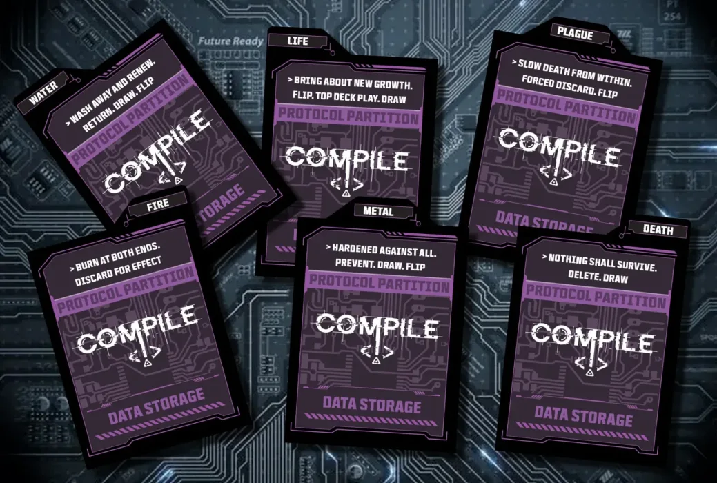 In het kaartspel Compile ben je een concurrerende Kunstmatige Intelligentie die probeert de wereld om je heen te begrijpen. Twee spelers selecteren elk drie Protocollen om te testen. Concepten variërend van Duisternis tot Water worden tegen elkaar uitgeprobeerd om ultiem begrip te bereiken. Speel kaarten in de commandolijnen van je Protocollen om de drempelwaarde te bereiken en je tegenstander te verslaan om te Compileren. Maar wees voorzichtig! Het verplaatsen en onthullen van kaarten heeft onmiddellijke acties. Je moet denken als een computer en vooruitdenken, anders speel je recht in de handen van je tegenstander. De eerste die alle drie de Protocollen Compileert, beheerst die concepten en wint het spel. Beheers de Protocollen van je tegenstander met kaaracties, Compileer de jouwe zo snel mogelijk en Compileer je realiteit.