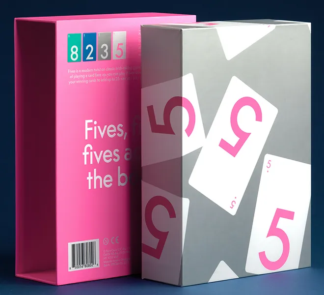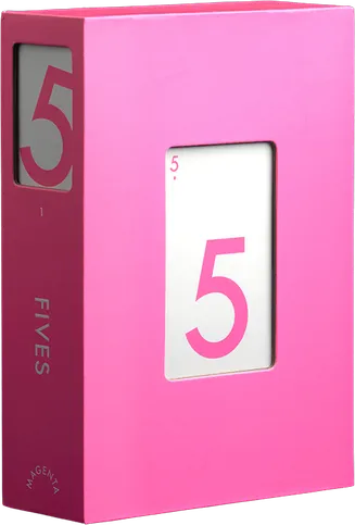 Fives is a trick-taking game for three or four players. The reverse side of the cards shows a magenta 5.