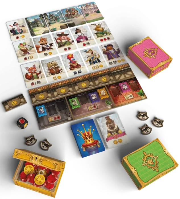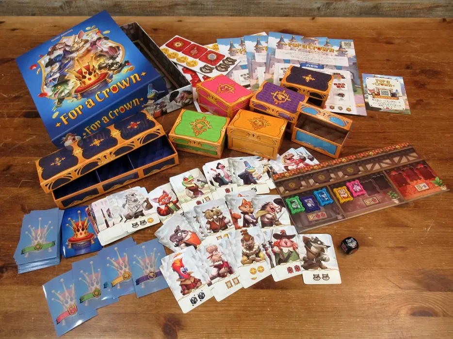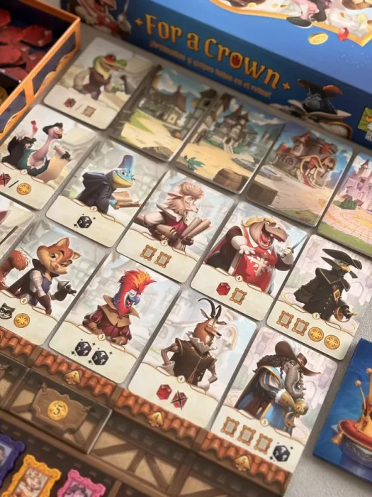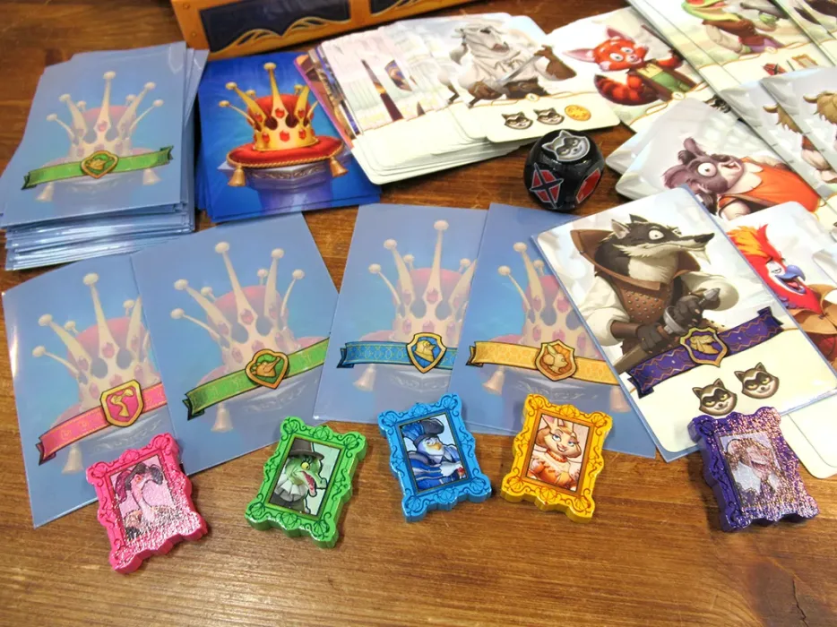 For a Crown is a single-deck, deck-building game. Players recruit new characters, such as mercenaries, then place these cards within a sleeve of their own color. All cards — individual player cards and common event cards — are shuffled into a single deck, which is then drawn card by card, with the relevant player resolving the effect of their card when it’s revealed.