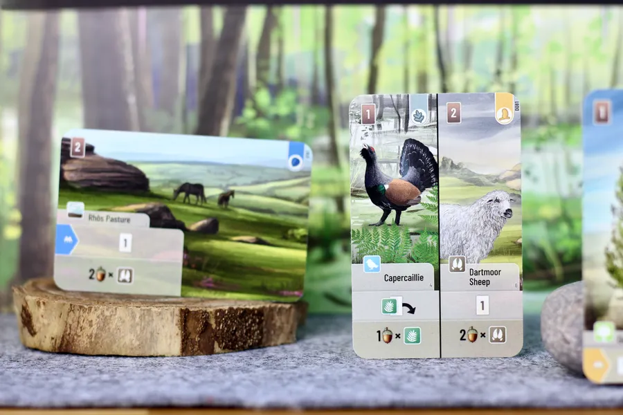 The game mechanism stays untouched: To start, each player has six cards in hand, with cards depicting either a particular type of tree, shrub or terrain or two moor dwellers (animal, plants), with these latter cards being divided in half, whether vertically or horizontally, with one dweller in each card half. On a turn, either draw two cards — whether face down from the deck or face up from the clearing — and add them to your hand, or play a card from your hand by discarding other cards to pay the cost, then putting that first card into play. In the end, the player with the highest score wins.
