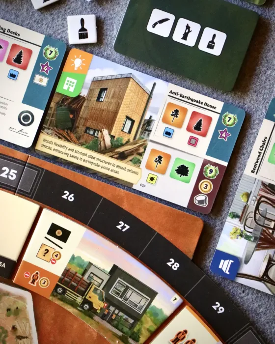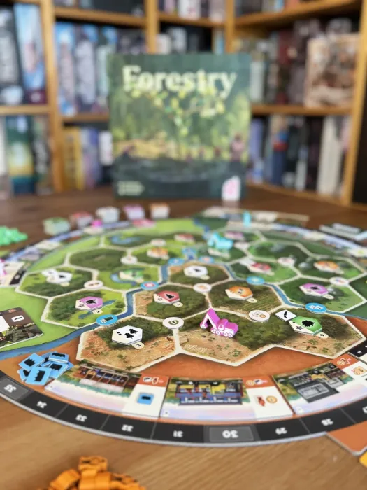As a Eurogame focused on strategic action management, Forestry relies on a dual-worker system in which players control a harvester and a manager, each with distinct responsibilities. The harvester moves through the forest, felling trees to meet contract demands, replanting saplings, constructing infrastructure, and adjusting water retention to promote a healthy ecosystem. Meanwhile, the manager oversees resource collection, utilizes sawmill buildings, fulfills contracts, and optimizes wood processing. Players must carefully allocate action points between these workers to make sustainable choices, enhance infrastructure, and ensure the forest thrives while meeting demand.