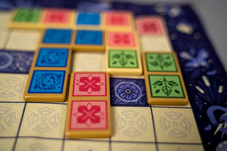 In Gazebo, players take turns placing dominos on the shared garden map to establish nooks — that is, two or more contiguous terrain spaces of the same type: flower, foliage, or water. When a player creates a nook, they place one of their gazebos on top of it, and by connecting their nook to a patio, they can claim the patio and place a gazebo on it.