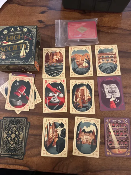 In High Society bieden spelers tegen elkaar om de verschillende attributen van rijkdom (positief-getal en vermenigvuldigingskaarten) te verwerven en tegelijkertijd valkuilen te vermijden (kaarten met negatief aantal en delers). Houd tijdens het bieden echter wel rekening met je resterende geld – aan het einde van het spel, hoewel al die kaarten met een positief nummer een overwinning kunnen opleveren, wordt de speler met het minste geld zelfs niet overwogen voor de overwinning.