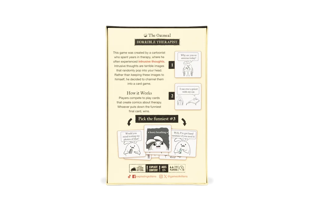Playing is simple: Compete to create the funniest and most unhinged three-panel comics about therapy by pairing Question Cards with Answer and Treatment Cards. Submit your combinations and watch your friends laugh, gasp, or be mildly offended (in the best, most wholesome way). The player with the funniest final card wins, turning intrusive thoughts into comedic gold.