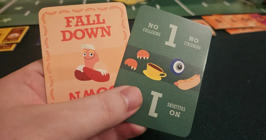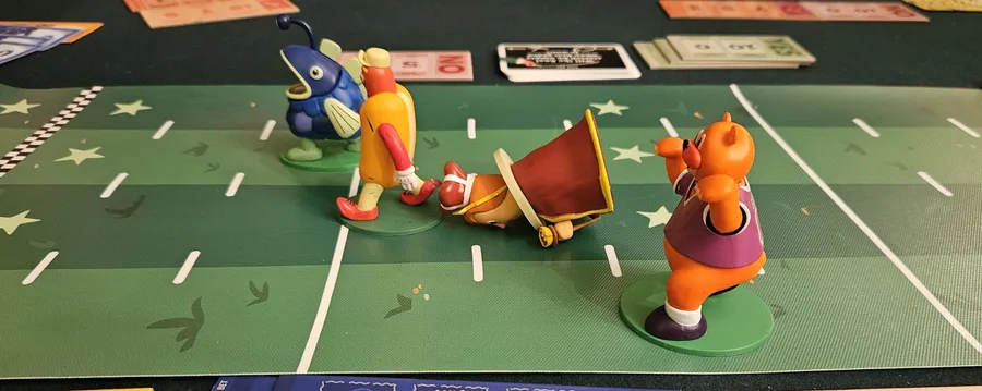 Shuffle the deck, burn three cards, then reveal cards one by one from the deck, moving the mascots along the track, with them sometimes swerving into another lane and knocking over another racer, sometimes turning around, sometimes all moving at once, and sometimes just going backwards! If a racer runs off the track or would be knocked over while already fallen, they’re disqualified. If needed, shuffle all cards in the deck, burn three cards again, and keep racing until all four spots on the box podium are filled. Pay out bets based on these results.