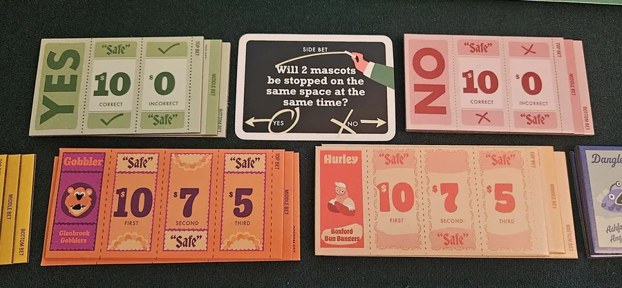 At the start of the game, set up the racing deck with one card for each mascot and a number of random cards based on the player count. Reveal these cards to all players, after which players draft a betting ticket from those on display, then in reverse order draft a second bet. For each bet, you can play it safe — or flip it to the risky side, which might pay out more – or cost you money if you lose. After betting, each player chooses one of three cards in their hand to secretly add to the racing deck.