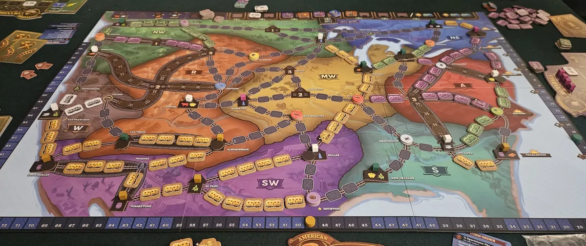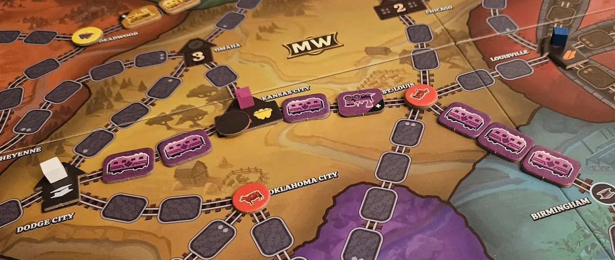 Build your bag to improve your company’s resources, then place your chips to open stations and train lines across eight regions of North America. There’s a fortune to be made by delivering goods to the cities that need them…but will you work together, or look to cut out the competition? Which stations do you need to secure a route to victory? How can the powerful lightning trains accelerate you past your rivals?