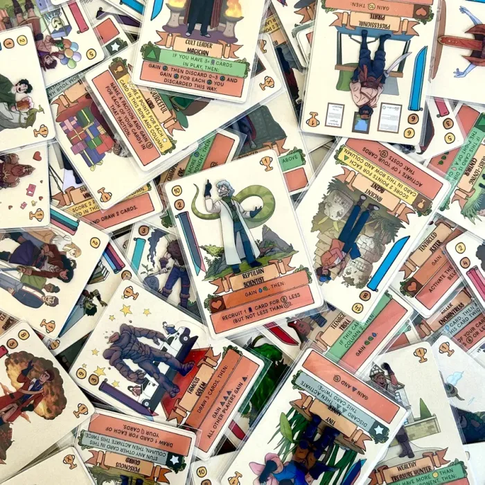 In Misfit Heroes, players are organizing crews in hopes of claiming influence to win over the hearts and minds of the citizens in nearby regions. The character cards players will use are different every time you play! Before a game, the cards you will use are created by placing each character transparency together with an attribute card in a card sleeve. You’ll never know which new characters are in the deck, and the combinations are almost endless!