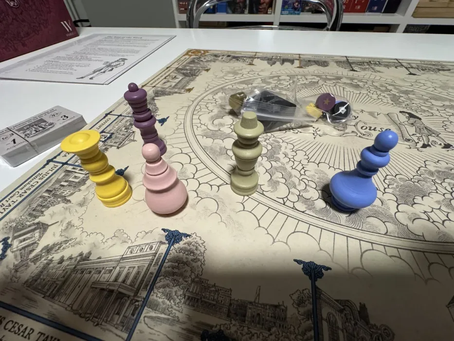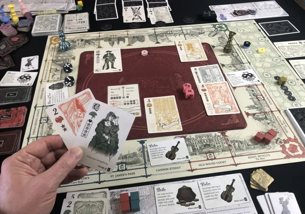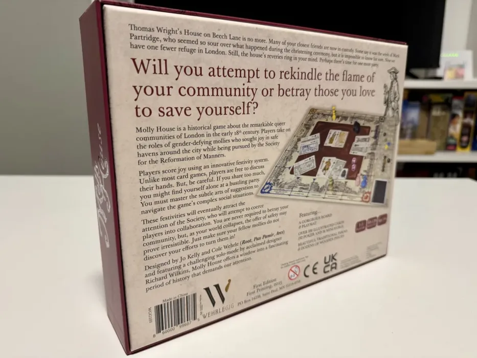 Players draft hands of vice cards representing the different gestures, desires, and encounters that were frowned upon by the Society for the Reformation of Manners, a citizen group that sought to stamp out any behavior it deemed deviant in late 17th and early 18th century London. These cards allow players to host festivities with the help of their fellow mollies and create joy. But, those same cards can also lead players to be arrested and to the ultimate ruin of the molly house.