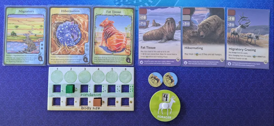 This module adds a fifth round to gameplay, a new deck of cards, an Arctic Tundra watering hole, a ‘cold die’ for the new Cold Level mechanic, new player aid, and additional instructions for the solo variant.
