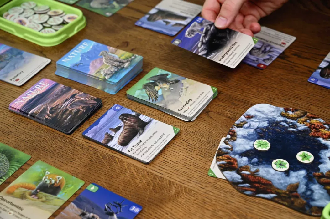 Nature is a card-driven tableau-builder played over 4 rounds. Each round is split between the Adapting Phase and the Feeding Phase.