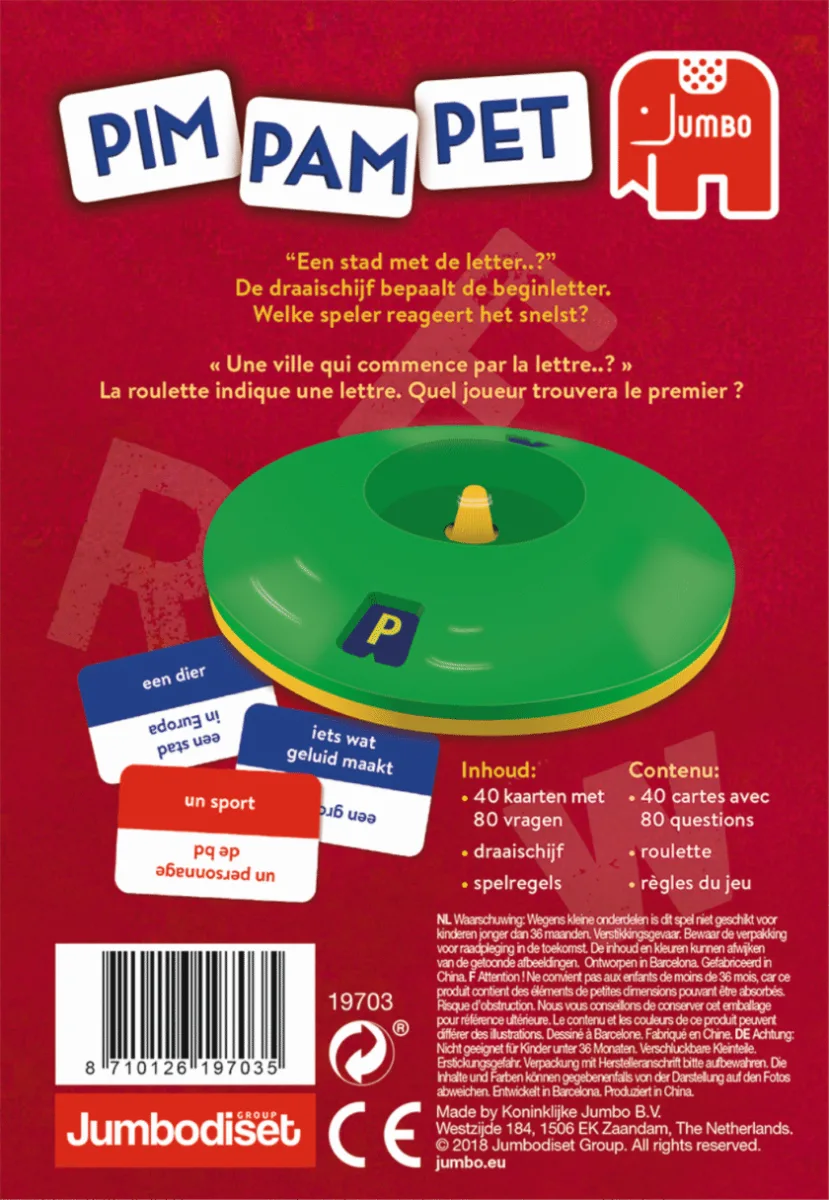 Pim Pam Pet Original is het meest gespeelde vraag- en antwoordspel voor de hele familie! Een stad met de letter..? De draaischijf bepaalt de beginletter. Welke speler reageert het snelst? Verdeel de spelers in twee gelijke groepen. Kies een spelleider (bijvoorbeeld de oudste, de langste enz.). De spelleider schudt de kaartjes en legt ze, omgekeerd, voor zich neer. Nu kan het spel beginnen! De spelleider draait het bovenste kaartje om en leest één van de twee vragen hardop voor. Daarna draait hij aan de draaischijf en roept de letter die bij het stilstaan zichtbaar wordt. De spelers moeten nu zo snel mogelijk de gestelde vraag beantwoorden; dit antwoord moet beginnen met de letter die op de draaischijf staat aangegeven. Degene die als eerste een goed antwoord geeft krijgt het kaartje. Degene die een fout antwoord geeft moet een kaartje aan de andere groep geven. Geven twee spelers tegelijk een goed antwoord, dan krijgt de speler die het langste antwoord (met de meeste letters) heeft gegeven, het kaartje. Als niemand een goed antwoord geeft, laat de spelleider opnieuw de draaischijf draaien. Het spel gaat zo door totdat alle vragen zijn beantwoord. De groep met de meeste kaartjes heeft gewonnen. Spelvariant: Je kunt ook met z’n tweeën spelen, of ieder voor zich. Bij een fout antwoord geef je dan een kaartje aan je tegenspeler, of aan de spelleider. Inhoud: • 40 kaarten met 80 vragen • draaischijf • spelregels