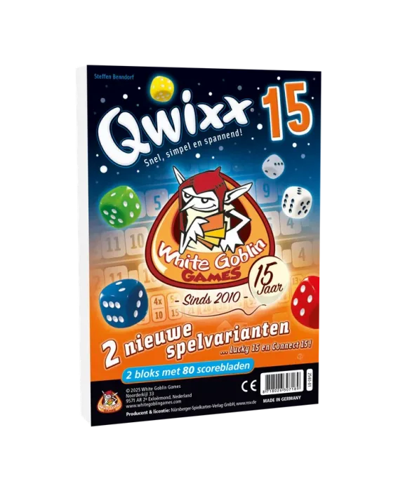Speciaal voor het 15-jarige jubileum van White Goblin Games is er een exclusieve uitbreiding van dobbelspel Qwixx met daarin twee gloednieuwe varianten: Connect 15 en Lucky 15! Deze varianten zijn speciaal voor WGG ontwikkeld en de eerste druk is voorzien van een speciale jubileum-verpakking. Deze editie bevat 2 varianten van ons bekroonde en populaire dobbelspel, voor meer diepgang, uitdaging en nóg meer speelplezier.