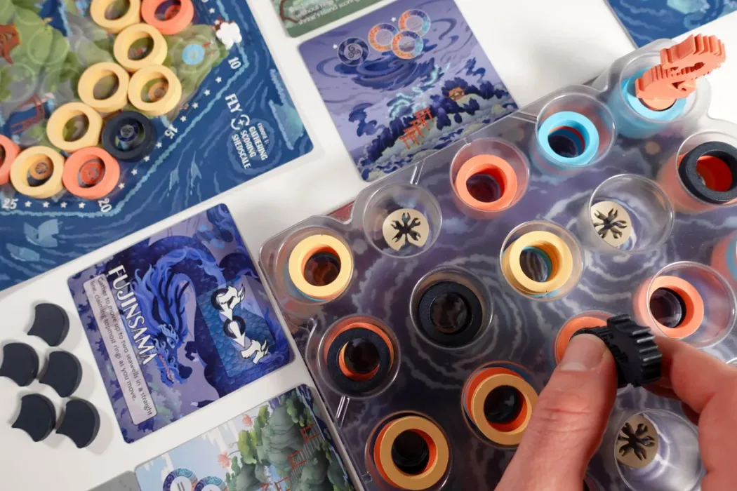 Drafting resources, collecting sets, and scoring bonuses in Tatsumi relies on the position of your dragon avatar on the seaboard, creating a more immersive and believable abstract strategy experience. The seaboard randomizes and stages the entire game’s resources into a 3-dimensional central board so you can strategically look ahead planning when to collect and when to score.