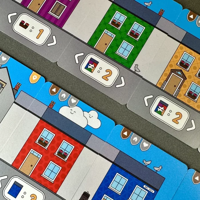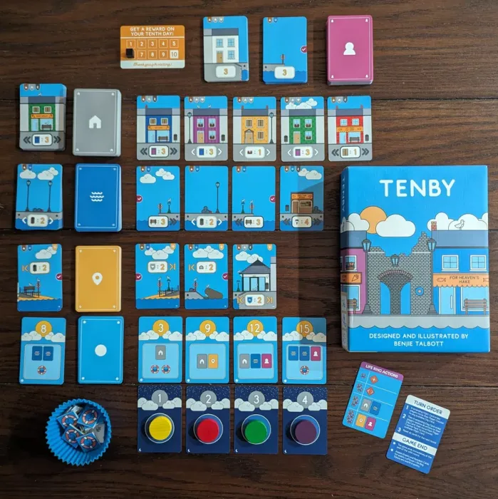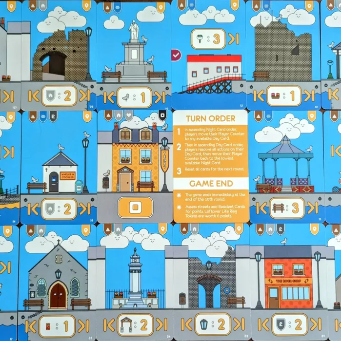 The aim of Tenby is to create the best town you can using the available cards. On your turn, you will draft and place cards to add terraces, piers, and Tenby town’s landmarks into your streets. If you can persuade a hard working local resident to help, you might just pick up some extra points! Whoever has the most points at the end of the game is the winner!