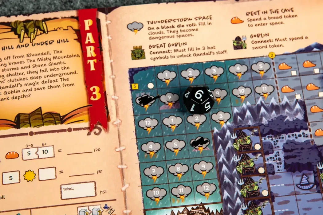 With your chosen dice, you use a dry-erase pen to mark the current chapter of your book, drafting a path to evade trolls, battle goblins, solve riddles, and pen the best conclusion to each chapter. The game takes players through the eight most iconic challenges faced by Bilbo and the Dwarves in The Hobbit, such as overcoming trolls, goblins, wargs, and giant spiders; reclaiming the treasure of the dwarves; and defeating the dragon Smaug. In the end, you want to complete the most rewarding journey to The Lonely Mountain.