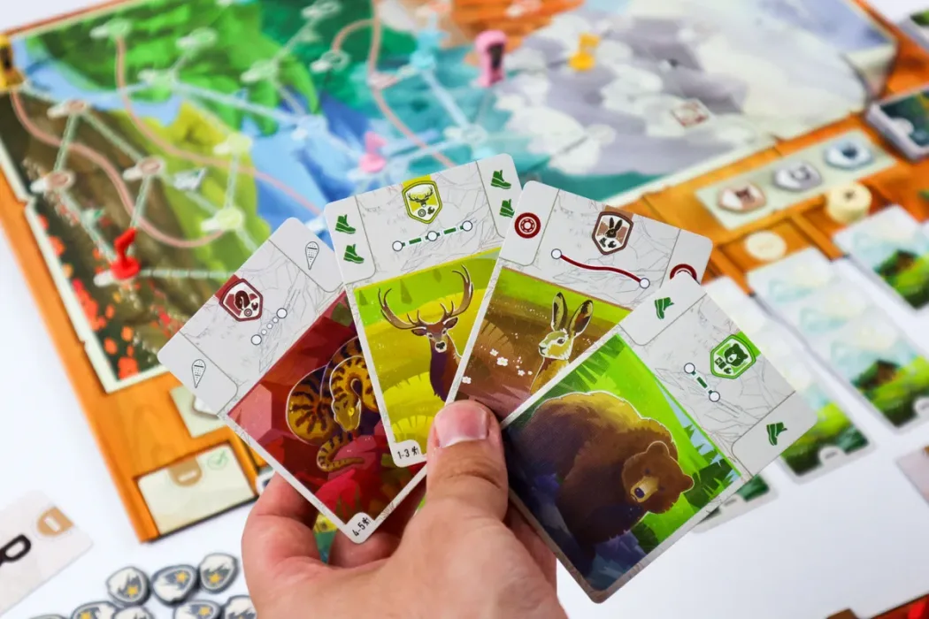 The main board represents the wildlife reserve, dominated by a towering mountain divided into distinct regions. Using a “reverse-drafting” mechanic, where each player assigns their cards to others, rangers will acquire the tools they need to explore the mountain via different paths and transportation systems.