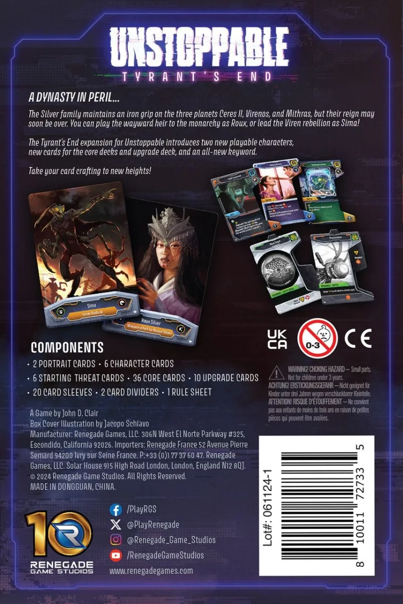 Unstoppable: Tyrant’s End introduces two new playable characters to Unstoppable, new cards for the core decks and upgrade deck, and a new keyword. Take your card crafting to new heights!
