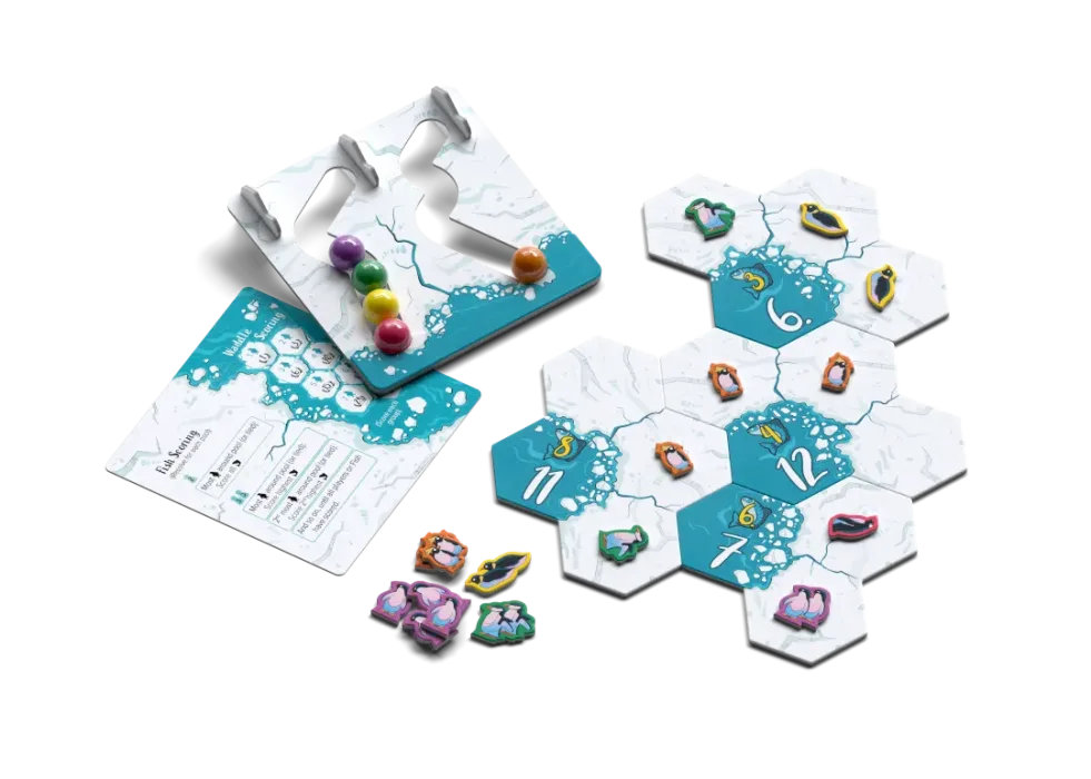 Strategically place your penguins to form groups and claim fish to score the most points! Turn order matters a lot; in Waddle, it’s tracked by marbles on a two-column track!