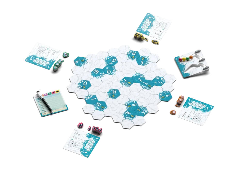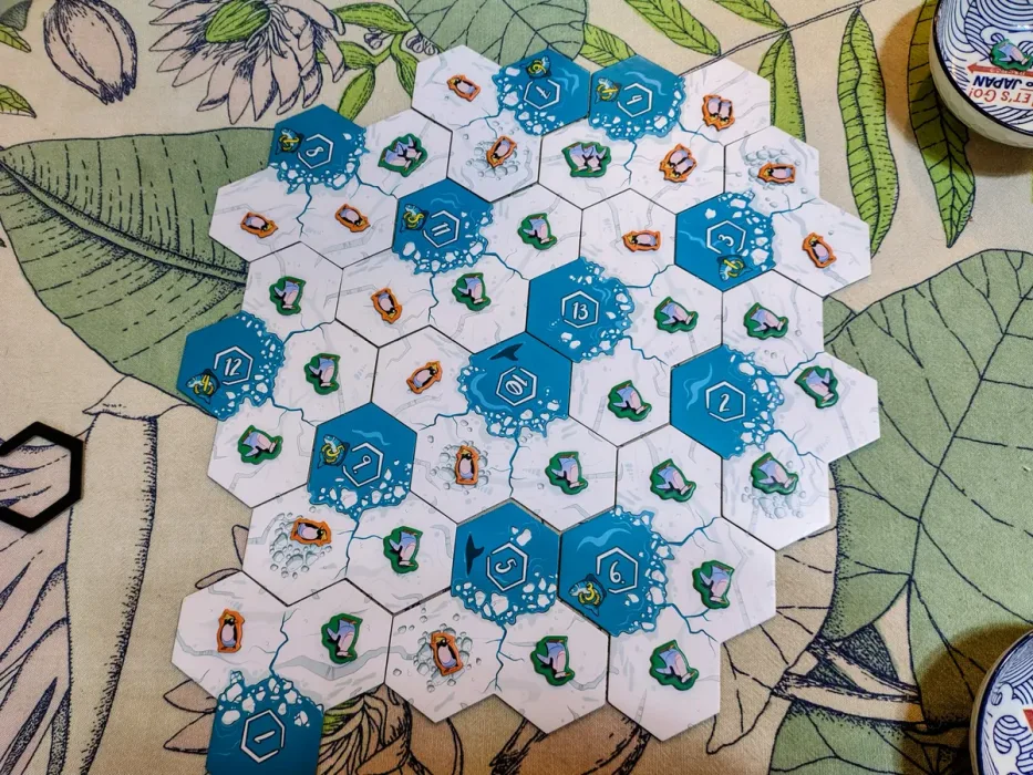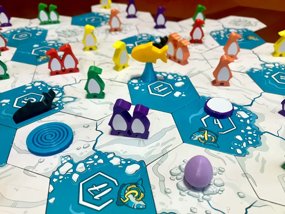 - “Place a Penguin” onto any unoccupied hex adjacent to the lowest numbered water hex. Then, pick up your marble and place it on the top of the same Turn Tracker column