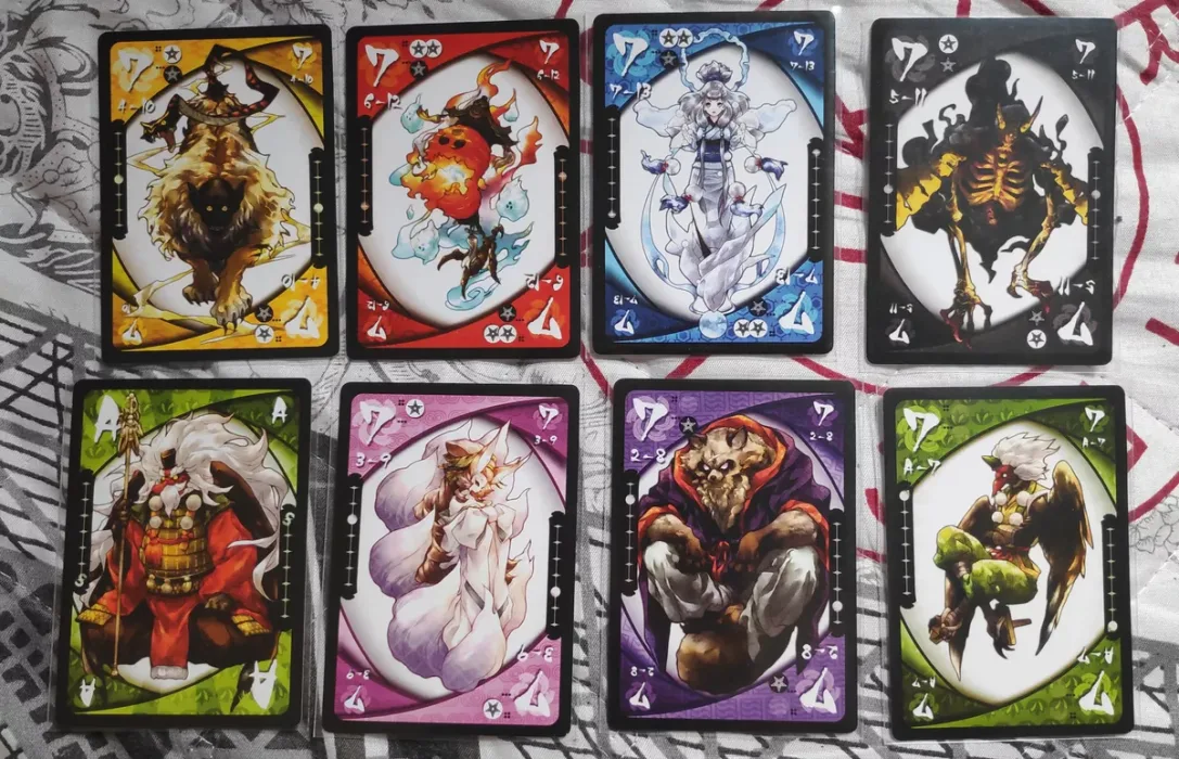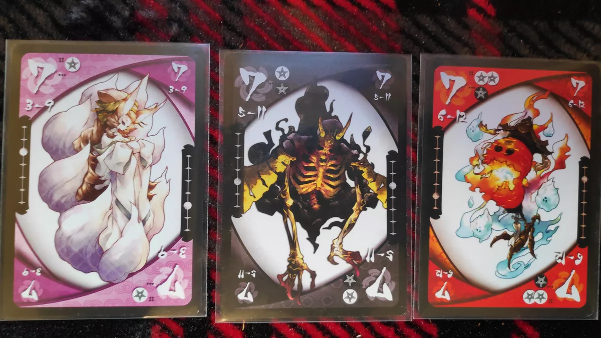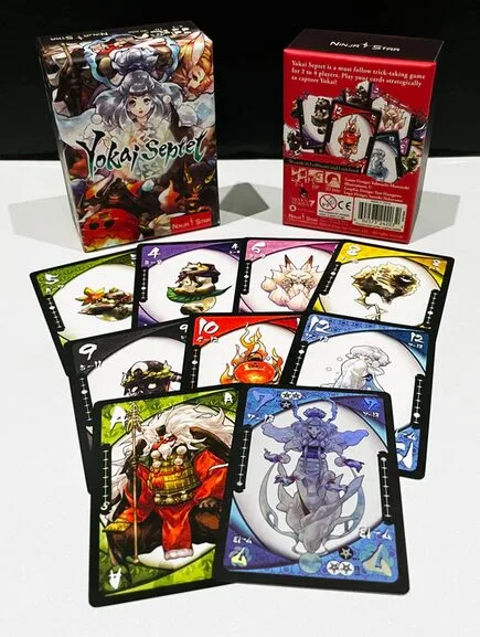 In Yokai Septet, your goal is to capture high scoring Boss Yokai by strategically playing cards from your hand. Each turn, players play a card from their hand following the rules of the “trick taking games.”