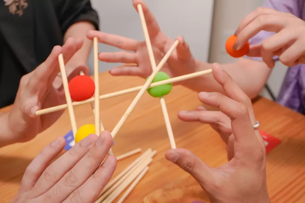 You can spice up the challenge by trying to place balls atop the sticks, but be warned! Each pair of sticks can only support one ball, and the balls can’t touch any other balls or fingers!